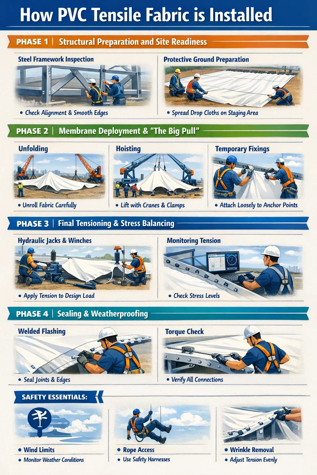 A instalação de Tecido elástico de PVC é altamente dependente do clima. Como o tecido funciona como uma vela gigante antes de estar totalmente preso, a velocidade do vento deve ser monitorada constantemente.