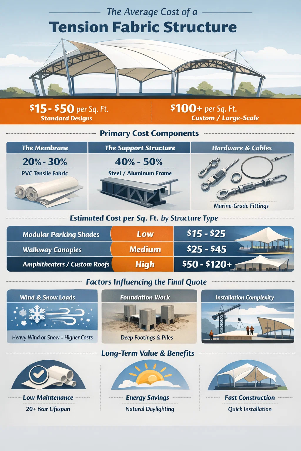 O custo de uma estrutura de tecido tensionado normalmente varia de US$ 15 a US$ 50 por pé quadrado para projetos padrão, enquanto projetos arquitetônicos altamente personalizados ou em grande escala podem exceder $ 100 por pé quadrado . Este preço não é apenas para o Tecido elástico de PVC em si; abrange um sistema completo, incluindo estrutura de aço projetada, hardware especializado, trabalho de fundação e mão de obra especializada de instalação. Como essas estruturas são projetadas sob medida para suportar cargas específicas de vento e neve, os preços variam com base na localização geográfica e na complexidade do projeto.