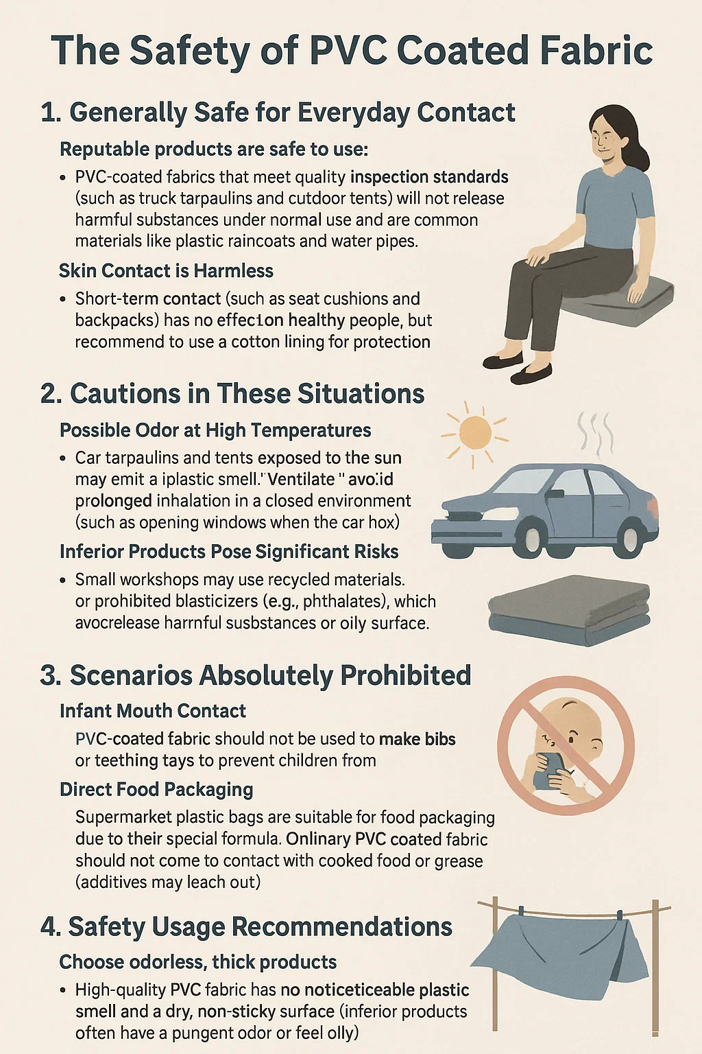 Produtos respeitáveis são seguros para uso: Tecidos revestidos de PVC que atendam aos padrões de inspeção de qualidade (como lonas de caminhões e barracas ao ar livre) não liberarão substâncias nocivas sob uso normal e são materiais comuns, como capas de chuva de plástico e canos de água.