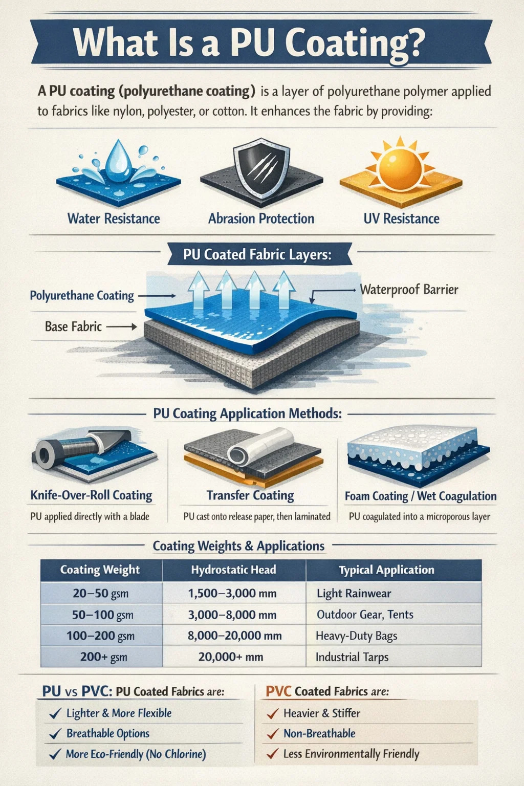 Um revestimento PU – abreviação de revestimento de poliuretano – é uma camada de polímero de poliuretano aplicada diretamente sobre um tecido base, como náilon, poliéster ou algodão, para melhorar suas propriedades de desempenho. O revestimento adere química e mecanicamente à superfície têxtil, criando uma película contínua e flexível que resiste à penetração de água, à abrasão e, em muitas formulações, à degradação ultravioleta.
