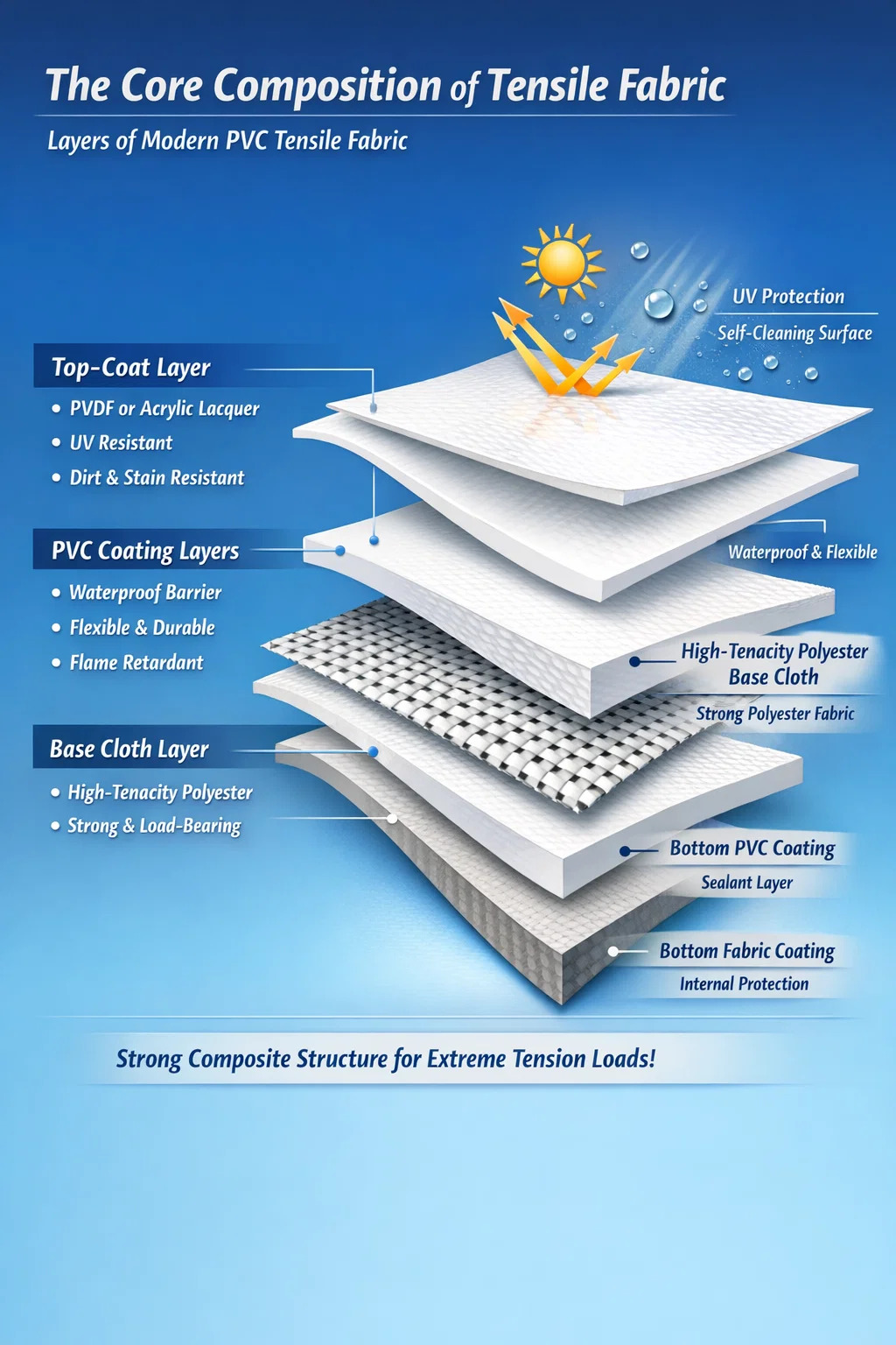 Mais moderno Tecido elástico de PVC é um material compósito sofisticado que consiste em três camadas primárias: uma tecido base de poliéster de alta tenacidade , uma espessura Revestimento de PVC (cloreto de polivinila) , e um especialista verniz de acabamento como PVDF ou acrílico. O tecido interno fornece a resistência estrutural para lidar com cargas de tensão maciças, enquanto as camadas externas de plástico protegem as fibras da degradação ambiental, da água e do fogo.