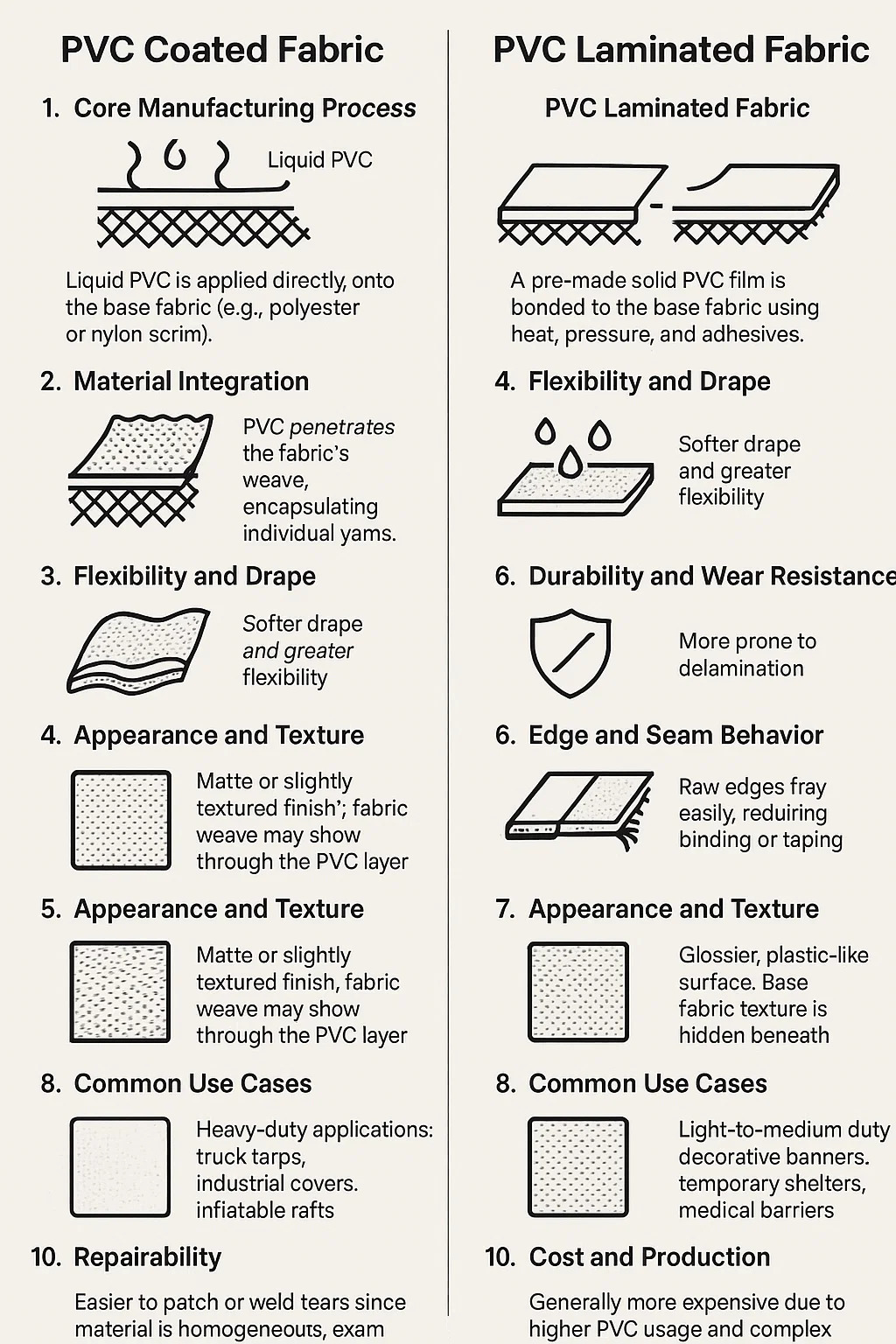 Aqui está a diferença entre Tecido revestido de PVC e tecido laminado de PVC explicado ponto a ponto:
